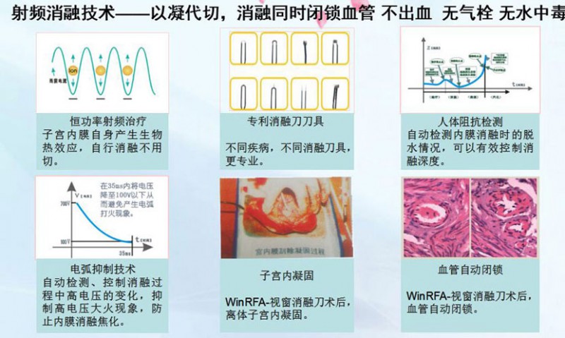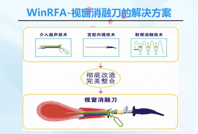 WinRFA•視窗消融刀是在雙重可視的監(jiān)控下,通過具有剪切、止血、凝固、剔除四大功能的消融刀具經(jīng)陰道、宮頸等自然腔道,將射頻電磁波準(zhǔn)確地介入到病變部位上,射頻電磁波激發(fā)病變組織的細(xì)胞進(jìn)行等離子振蕩,離子相互摩擦產(chǎn)生生物高熱效應(yīng),溫度達(dá)到80-100度,從而有效的消融病變組織并凝固血管,射頻治療系統(tǒng)能智能控制病變組織的變性程度和范圍,最后使病變組織變性、壞死和排出體外,達(dá)到治療子宮出血(DUB)、子宮切口(瘢痕)妊娠、腺肌瘤(?。┑燃膊〉哪康摹?/span>
