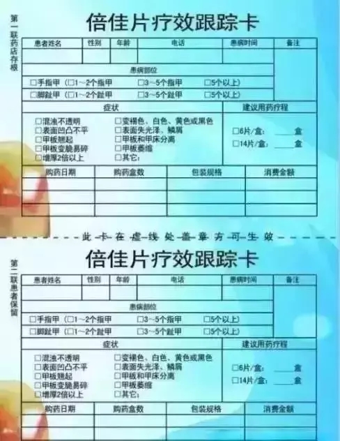 1、進(jìn)店咨詢并確診為灰指甲的患者,可領(lǐng)取倍佳片療效跟蹤卡一張。
